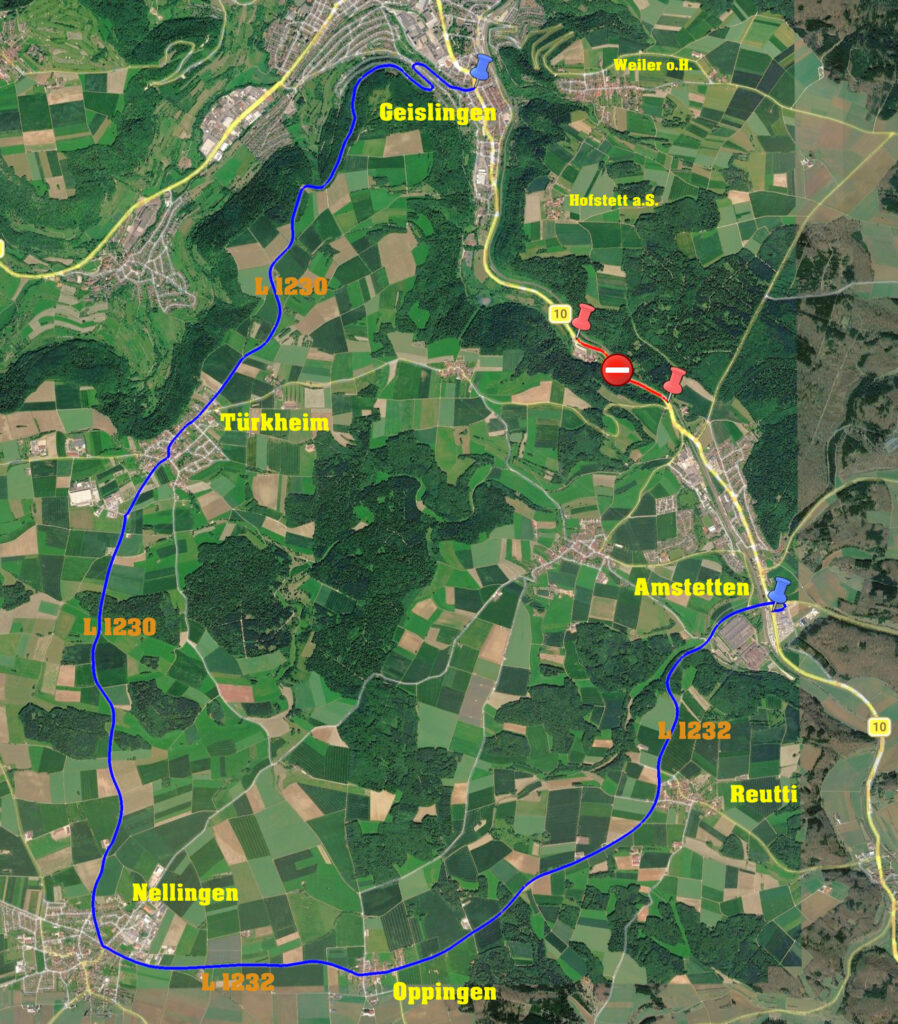 Die Umleitung verläuft über die L1230 Geislingen-Türkheim-Nellingen und weiter über die L1232 Oppingen-Reutti-Amstetten und umgekehrt.