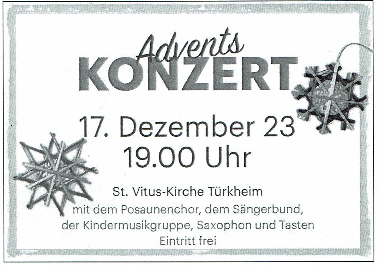 Adventskonzert Termin Details Datum: 17. Dezember 2023 19:00 – 20:00 Ort: St.Vitus Kirche Türkheim Mitteilungsblatt Türkheim-Aufhausen vom 15.11.2023