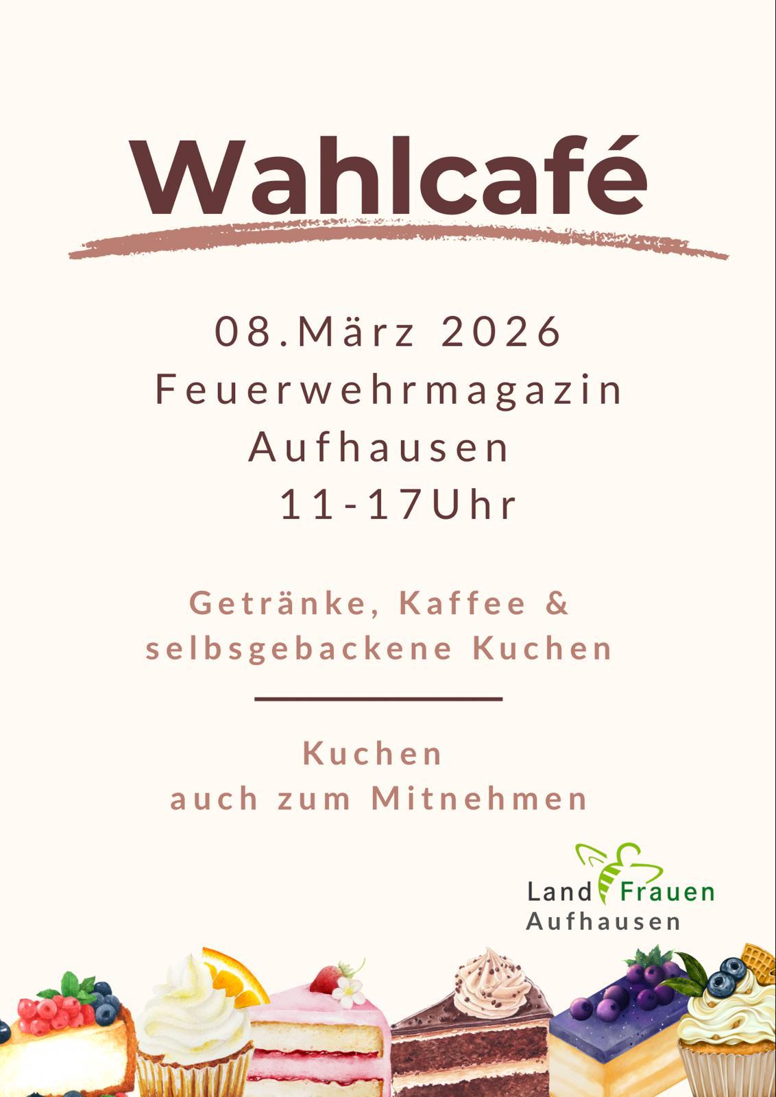 Landfrauen Aufhausen – Wahlcafe Termin Details Datum: 8. März 2026 11:00 – 17:00 Ort: Feuerwehrmagazin Aufhausen