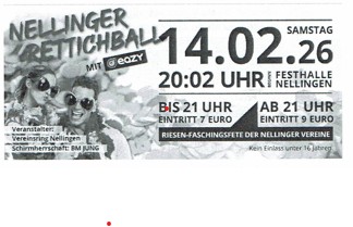 Nellinger Vereine – Rettichball Termin Details Datum: 14. Februar 2026 20:02 – 23:59 Ort: Festhalle Nellingen Quelle: Mitteilungsblatt für Türkheim und Aufhausen vom 24.01.2026