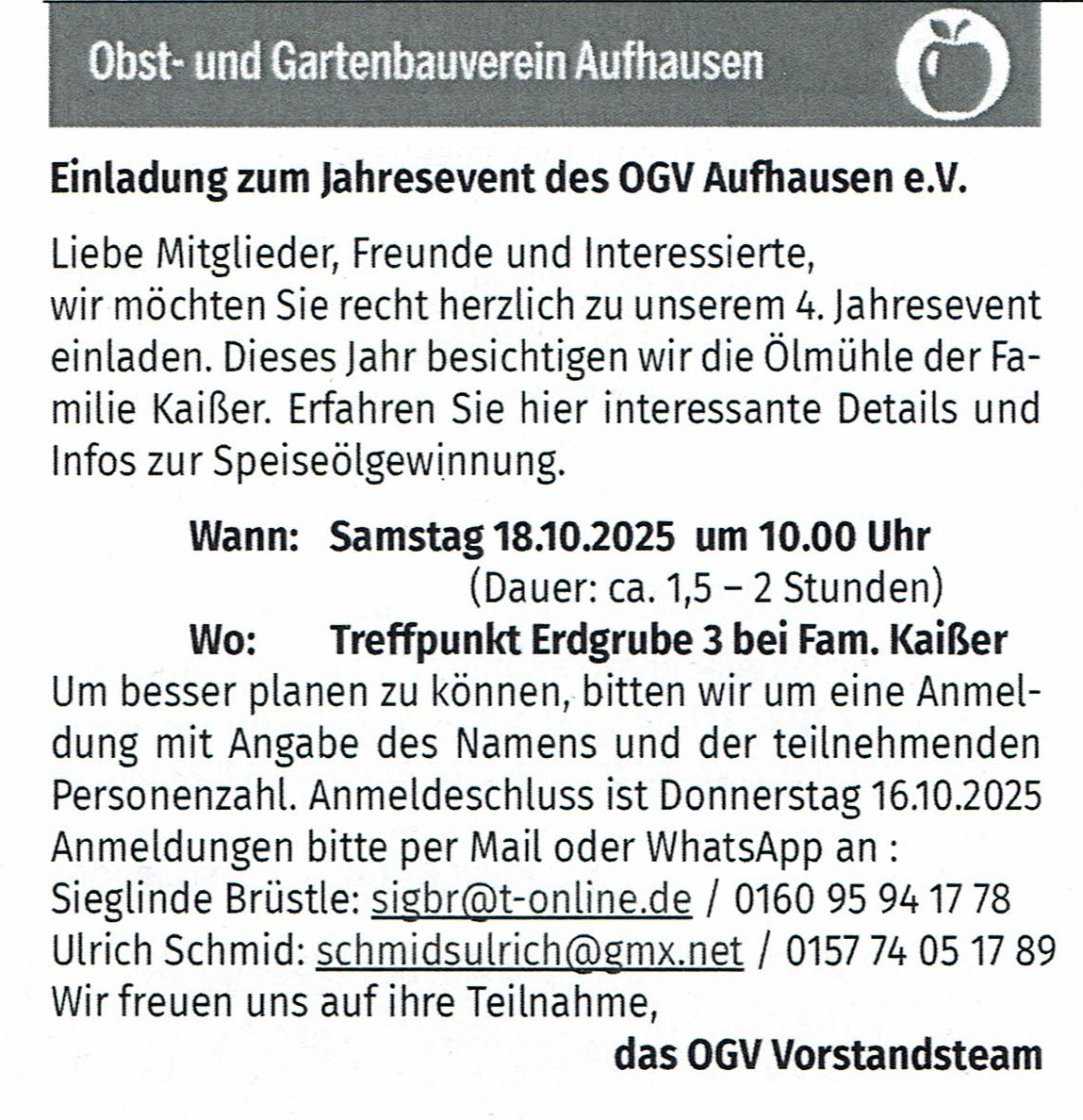 OGV Aufhausen – Einladung zum 4. Jahresevent Termin Details Datum: 18. Oktober 2025 10:00 – 12:00 Ort: Kaiser-Hof