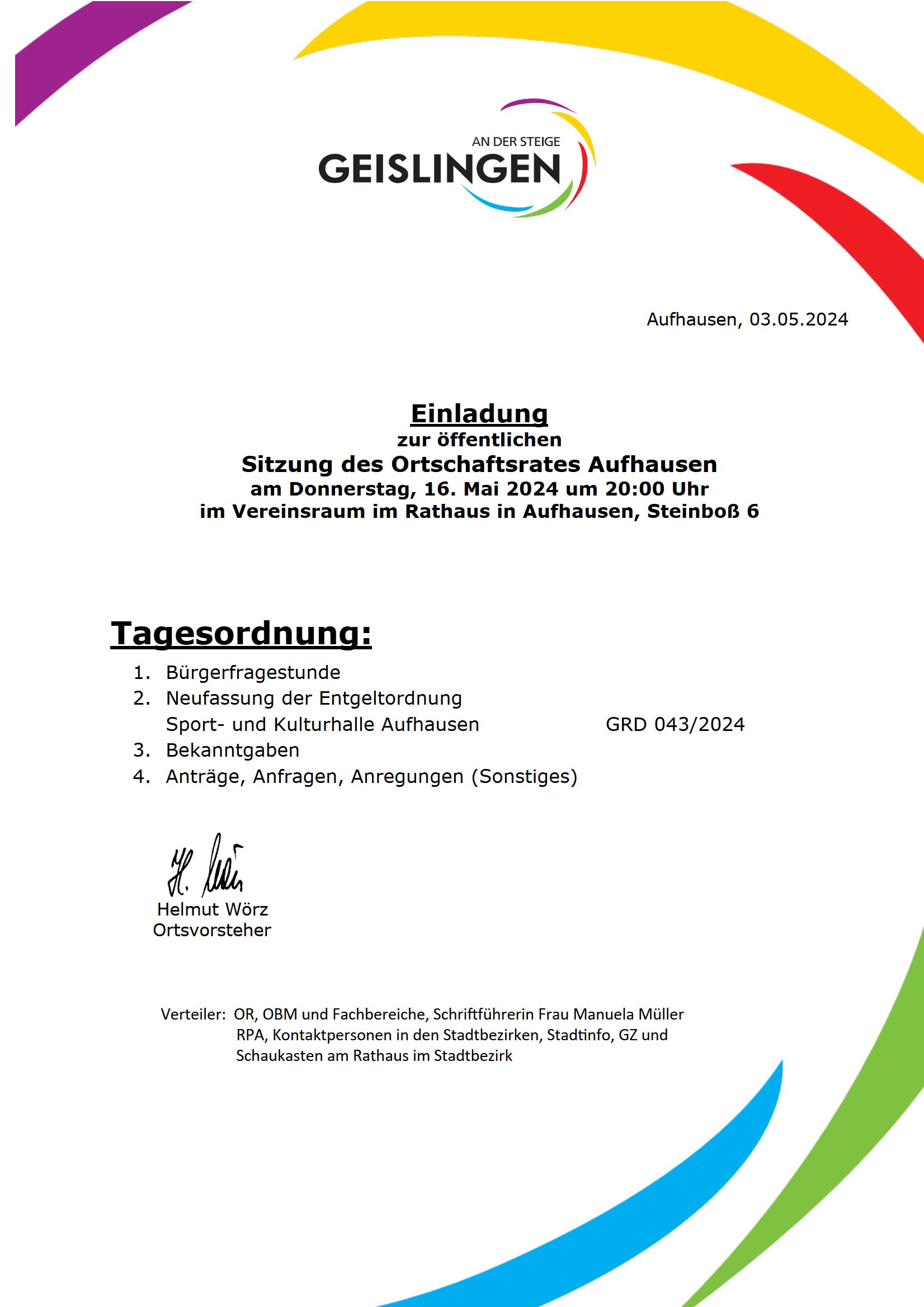 OR Aufhausen – Sitzungseinladung Termin Details Datum: 16. Mai 2024 20:00 – 22:00 Ort: Vereinsraum Rathaus Aufhausen