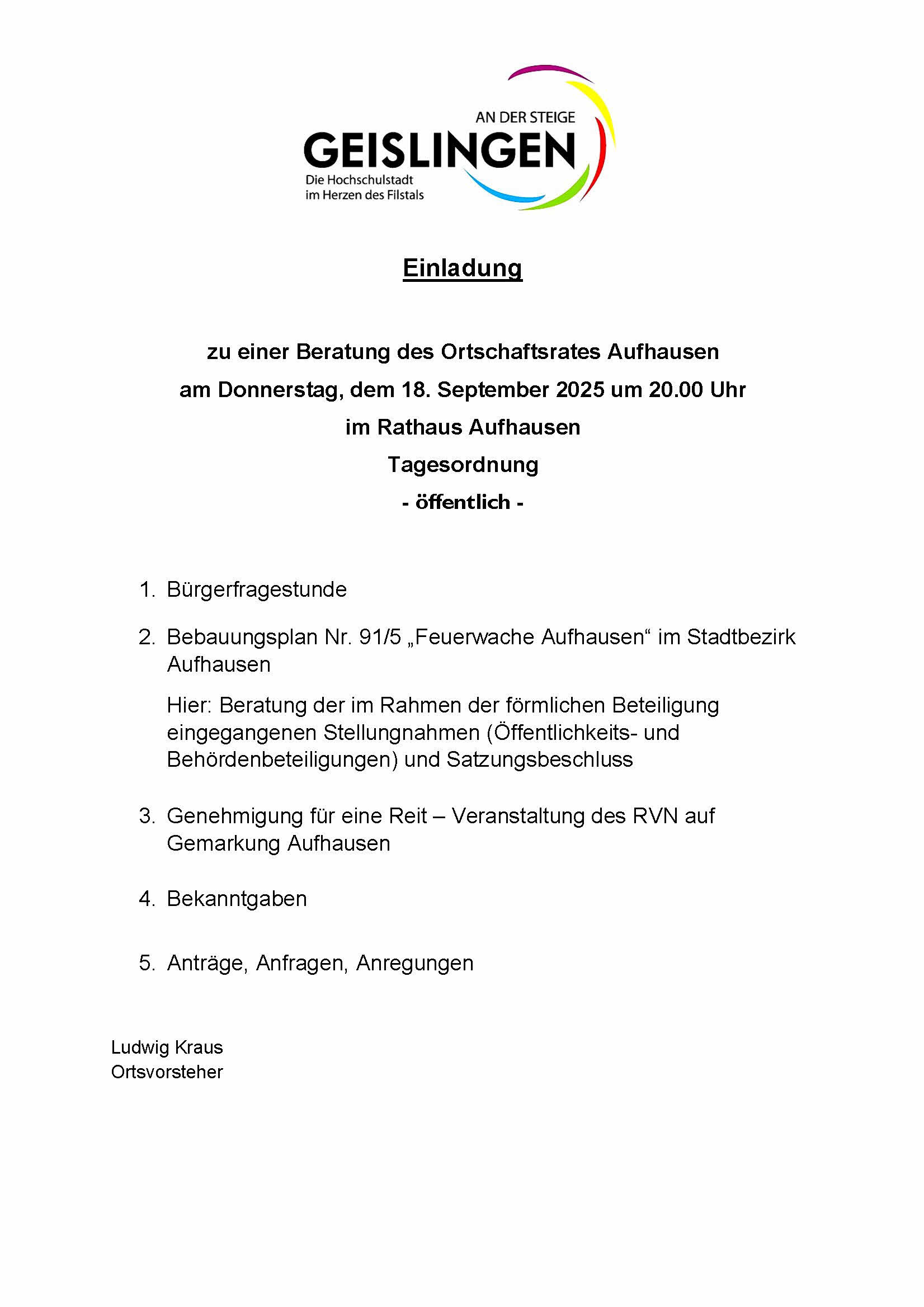 OR Aufhausen – Sitzungseinladung Termin Details Datum: 18. September 2025 20:00 – 22:00 Ort: Vereinsraum Rathaus Aufhausen