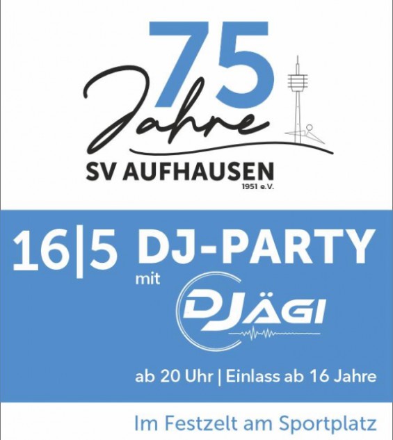 SVA Aufhausen – DJ Party Termin Details Datum: 16. Mai 2026 20:00 – 23:59 Ort: Festzelt am Sportplatz Aufhausen