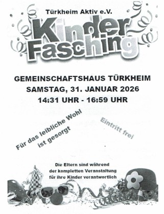 Türkheim Aktiv – Kinderfasching Termin Details Datum: 31. Januar 2026 14:31 – 16:59 Ort: Gemeinschaftshaus Türkheim Quelle: Mitteilungsblatt für Türkheim und Aufhausen vom 24.01.2026