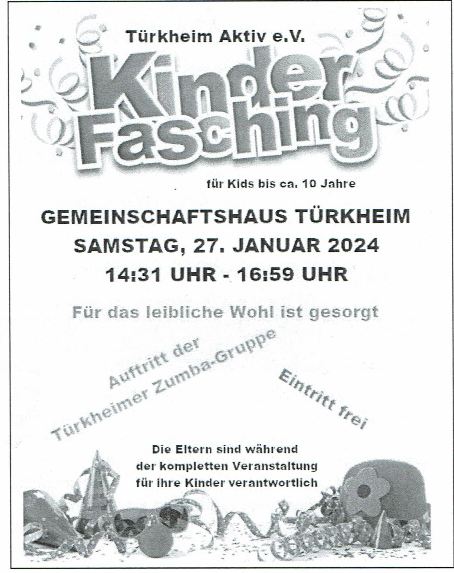 Türkheim Aktiv – Kinderfasching Termin Details Datum: 27. Januar 2024 14:31 – 16:59 Ort: Gemeinschaftshaus Türkheim Mittelungsblatt für Türkheim und Aufhausen vom 10.01.2024